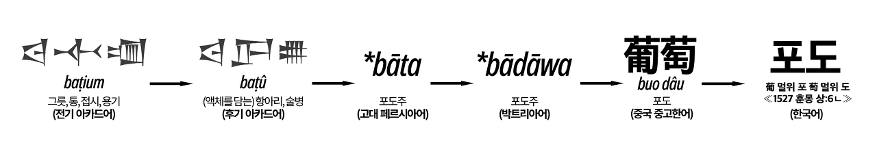 '포도'라는 이름의 유래는 페르시아의 친척어인 박트리아어에서 포도주를 뜻하던 단어 'bādāwa'로, 더 구체적으로는 아카드어 'batu(포도주 항아리)', 'batium(용기)'가 어원인 매우 오래된 단어이다. 이 이름이 중국으로 건너와 '蒲陶(포도)', '蒲萄(포도)'로 음차 되었다가 나중에 '葡萄(포도, 중고한어 발음으로 /buo dau/)'로 통일되었고 이 한자어가 다시 동아시아 각국에 전파되었다.
